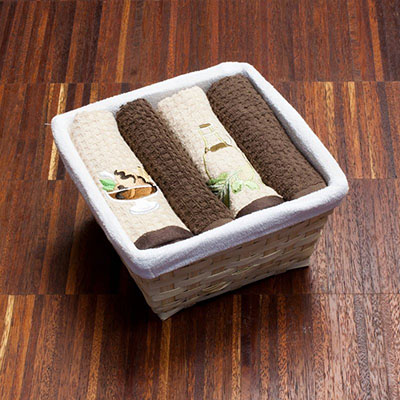 Kuchynské utierky – Sety: vždy 2 a 2 utierky o rozmere 40x70cm v prútenom košíku.