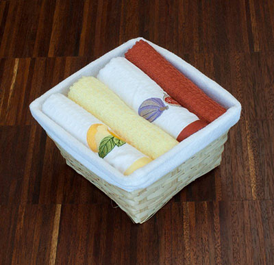 Kuchynské utierky – Sety: vždy 2 a 2 utierky o rozmere 40x70cm v prútenom košíku.